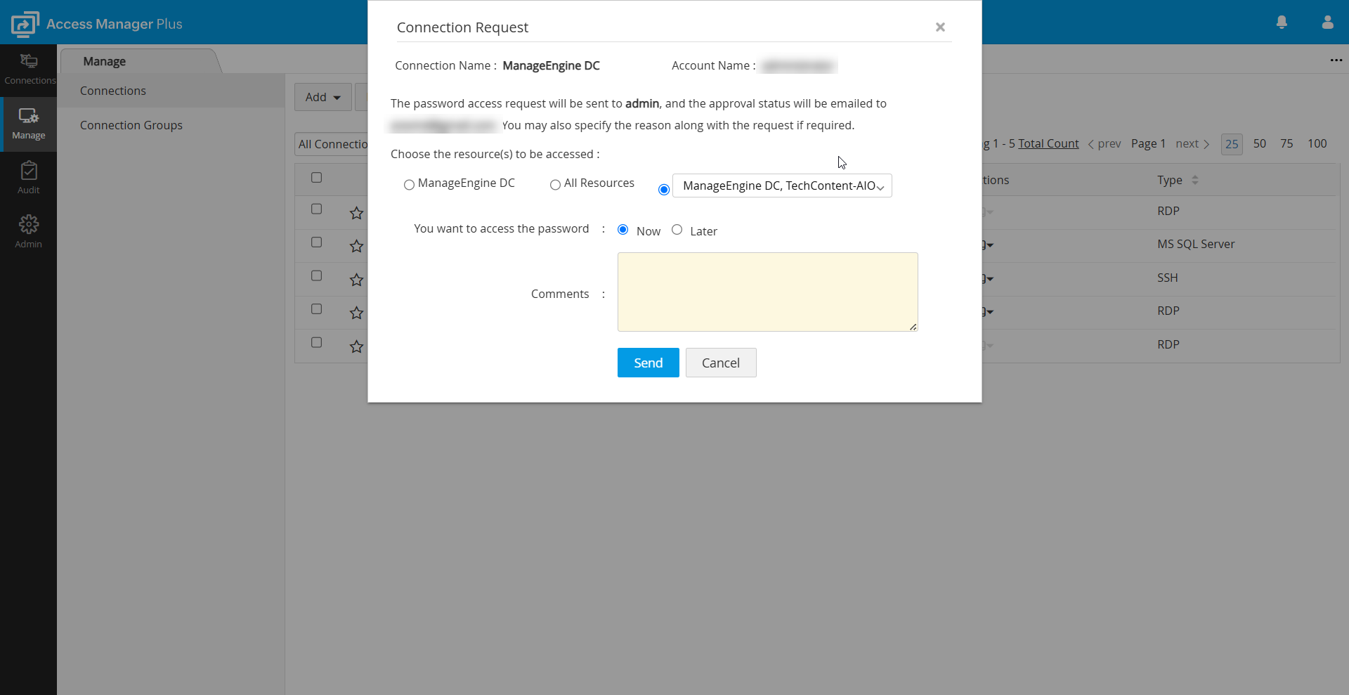 Access Manager Plus provides an access control workflow mechanism that allows users to restrict access to the connections added by them. When the access control is in place, no user other than the one who added the particular connection will be able to view the passwords or launch a remote connection unless their access request is approved by the owner.