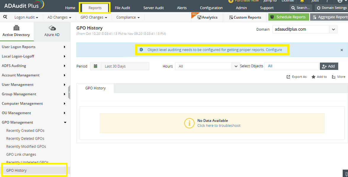 Automatic object level auditing configuration can be done by: log in to the ADAudit Plus web console → Reports → GPO Management → GPO History → Object level auditing needs to be configured for getting proper reports: Configure.