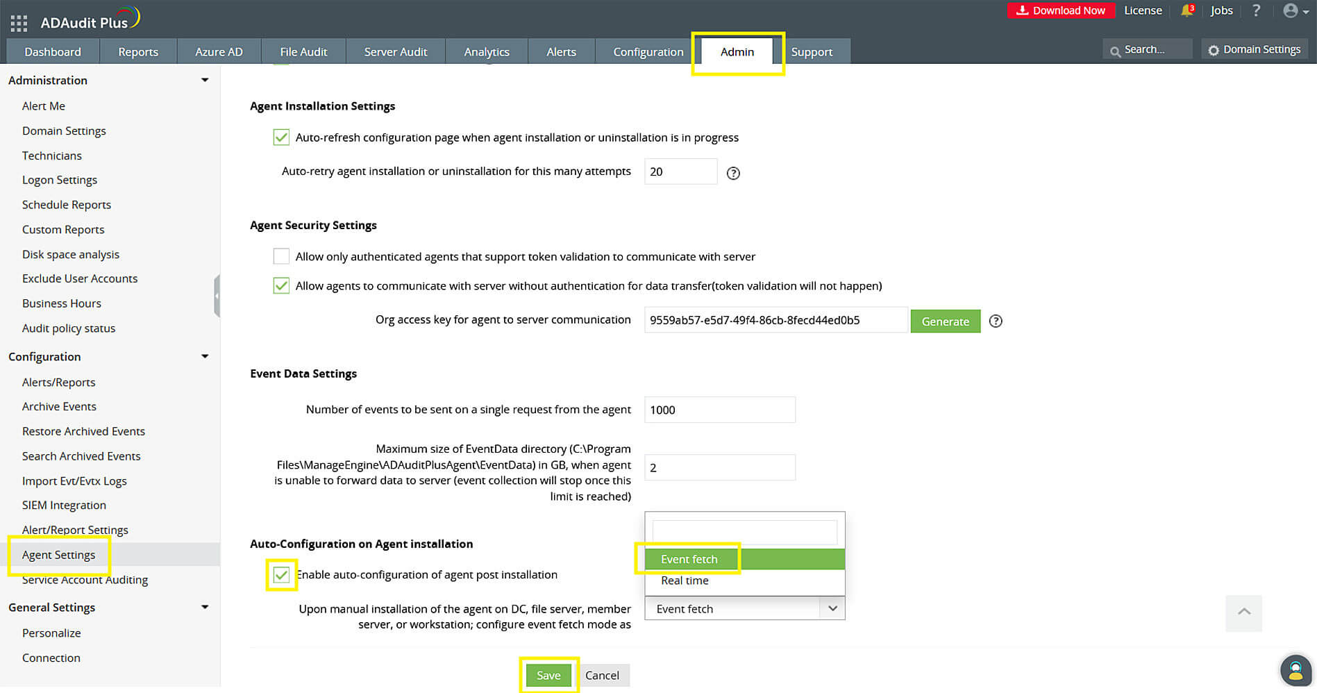 - Go to ADAudit Plus web console → Admin → Agent Settings.