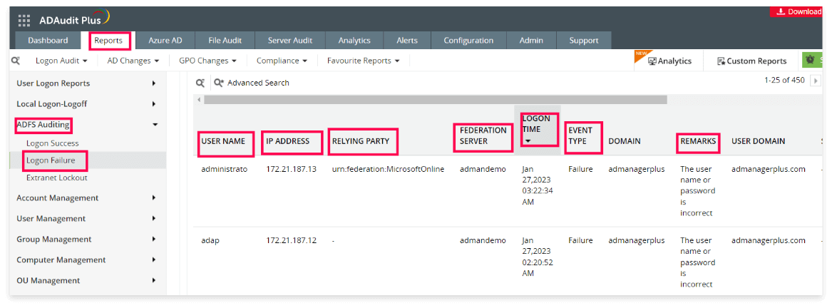 This failed user logon action can be easily audited using the Logon Failure report of the AD FS Auditing module in ADAudit Plus.