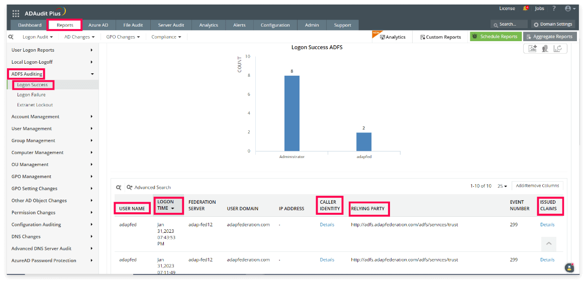 Regina’s logon activities can be easily audited with the Logon Success report of the AD FS Auditing module in ADAudit Plus. The report provides key insights (refer to Figure 2) such as the federation server which authenticated her request, the name of the relying party (resource or application), and the claims issued.