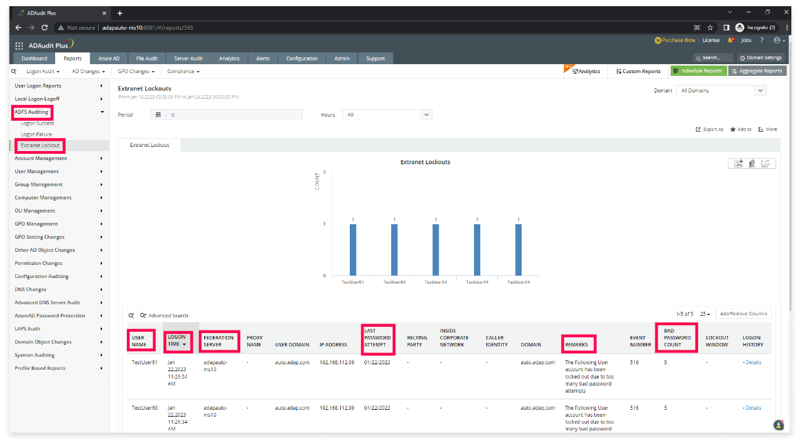 We’ll now discuss the Extranet Lockouts report of AD FS Auditing module in ADAudit Plus. This report helps admins gain these detailed insights: (See Figure 6).