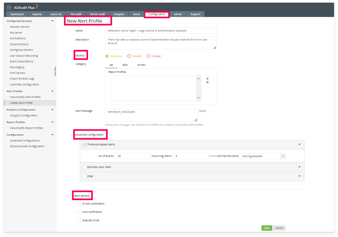 ADAudit Plus supports administrators by providing them with real-time alerts and automated scripts to address activities such as unauthorized logon attempts via federation servers.
