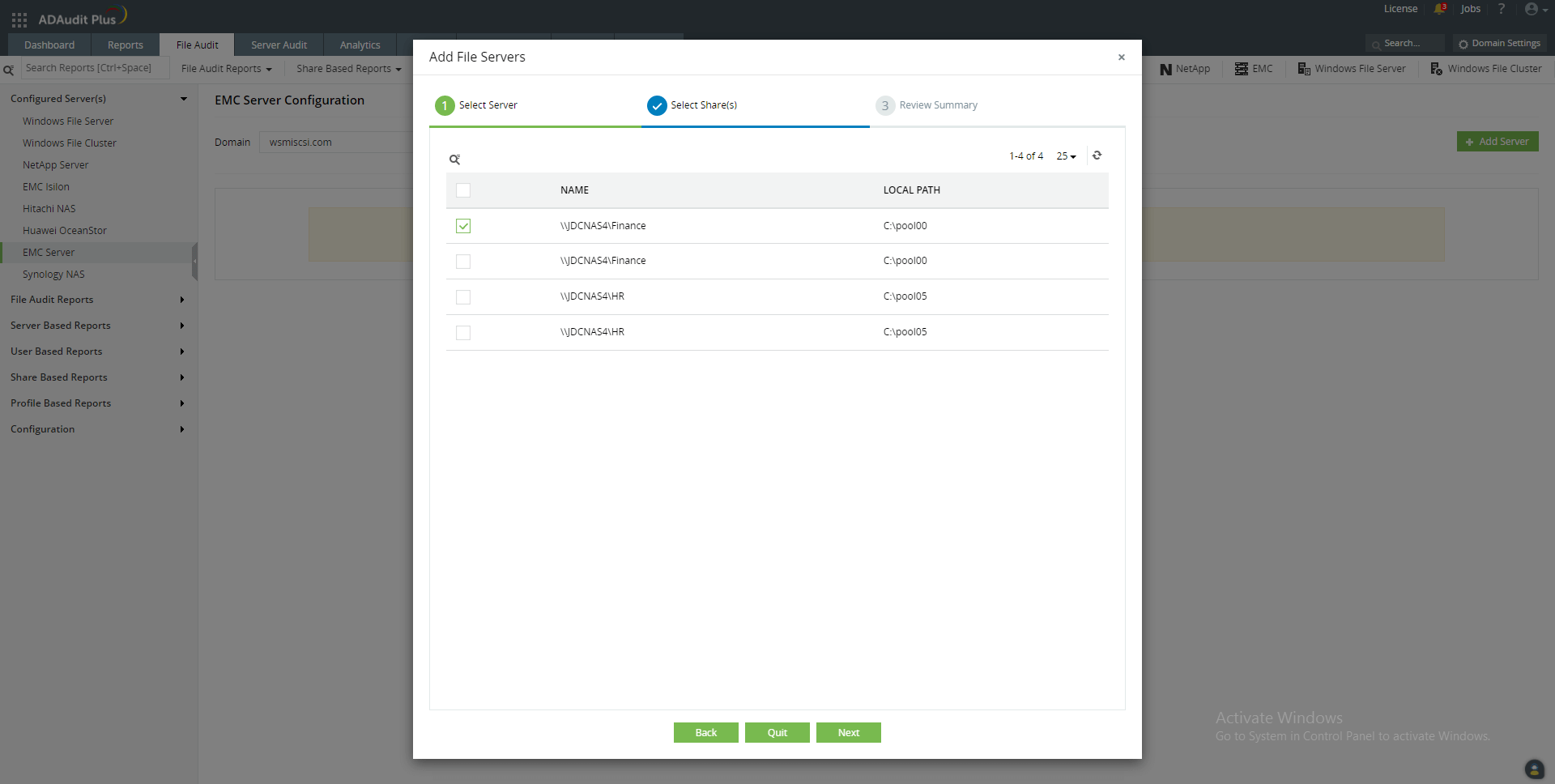 - Select the shares you wish to audit and click Next.