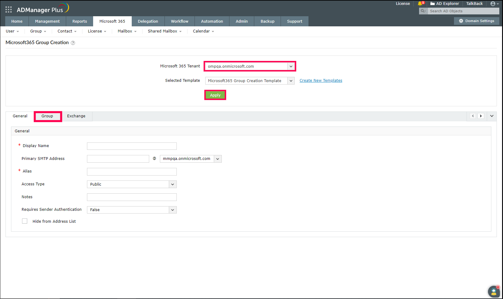 - Log in to ADManager Plus and navigate to Microsoft 365 tab > Management > Group Management.