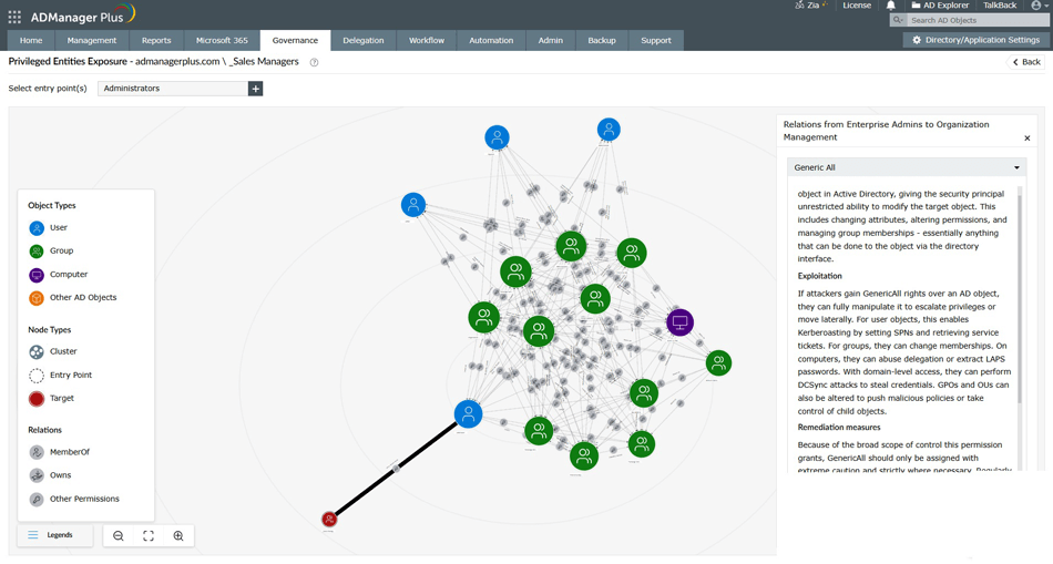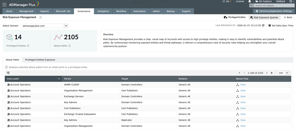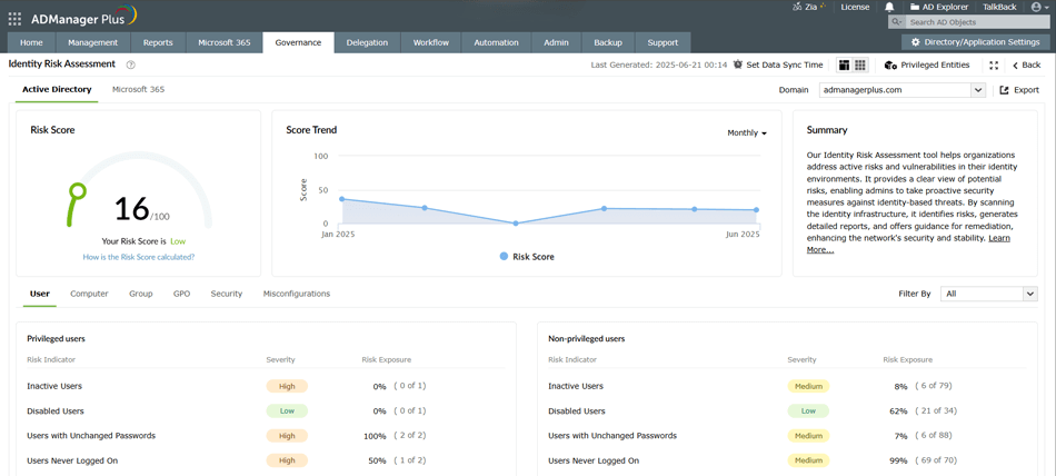 ADManager Plus helps you assess identity risks, understand exposure, and take action across AD and Microsoft 365 to reduce the likelihood of identity-based attacks.