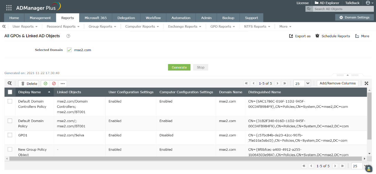 ADManager Plus simplifies the management and reporting of GPOs by providing comprehensive tools that allow administrators to generate detailed, granular reports in readable formats. It also helps administrators in the pain-free management of all the Group Policies in the organization through its GPO management capability. With ADManager Plus, administrators can efficiently monitor and manage their GPOs, ensuring the optimal functioning and security of their AD environment.
