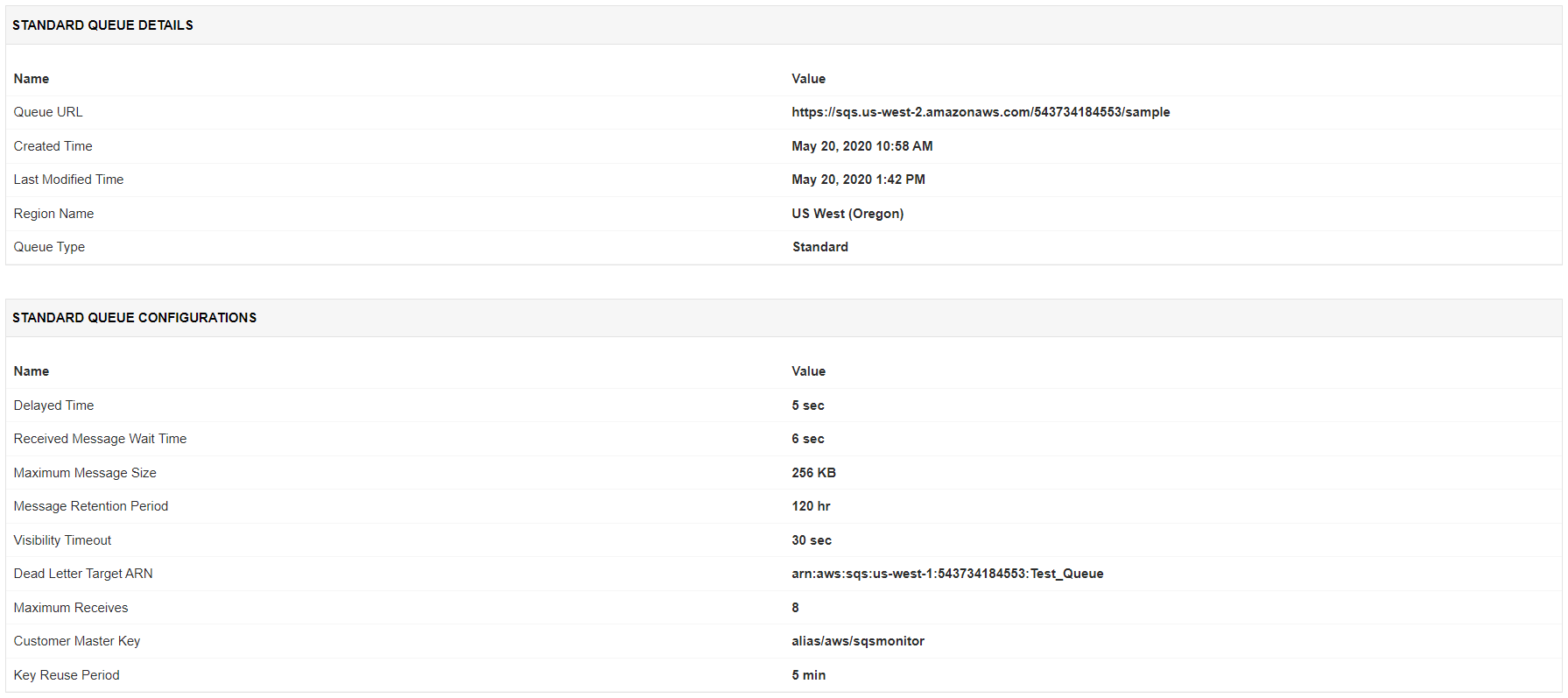 Applications Manager's AWS SQS monitoring tool displays details about the queue, be it a FIFO queue or a standard queue. Configuration setting data like Received Message Wait Time, Maximum Message Size, Message Retention Period, Visibility Timeout, and more are available at your disposal. You can also monitor the number of delayed messages and the delay time period in standard queues.