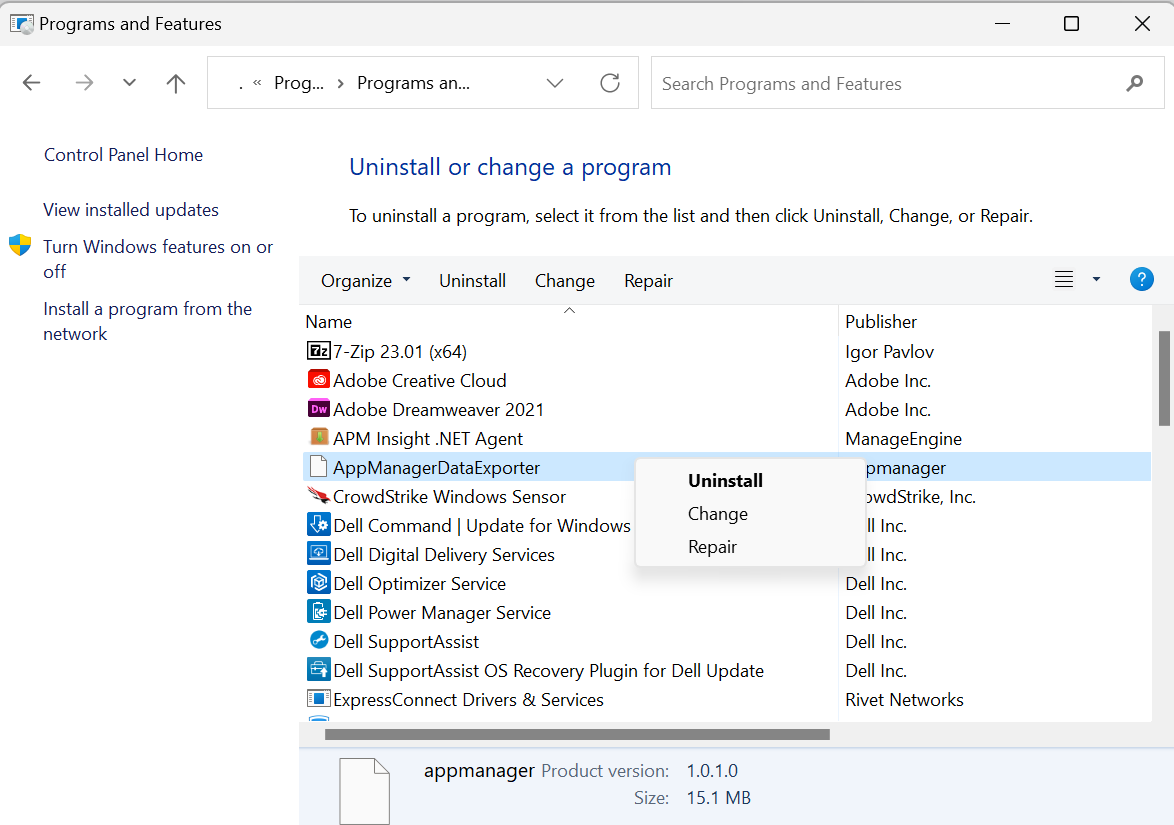 Execute the uninstallation commands given below to uninstall the AppManagerDataExporter: