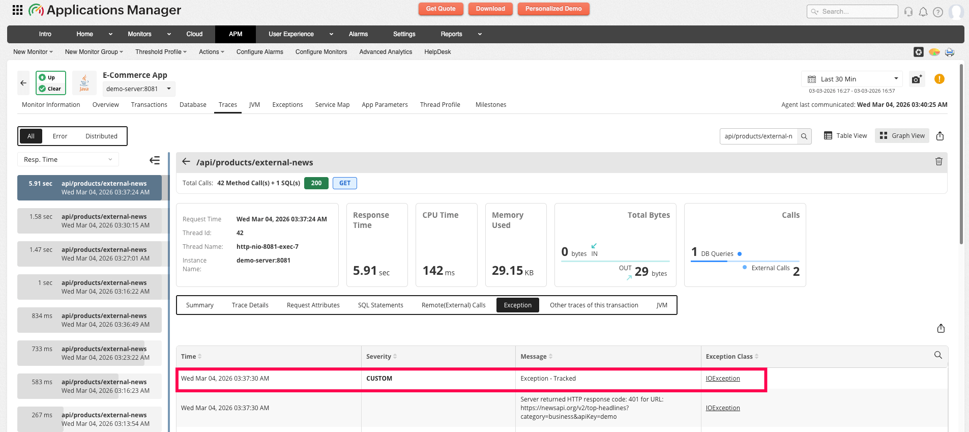 Normally, the agent captures exceptions that have been logged or uncaught. In most cases, developers tend to catch exceptions and handle them within the code without propagating them. These kind of exceptions can be tracked using this API. With the Java Agent API, you can provide a custom message and actual throwable exception object and track exceptions when they occur.
