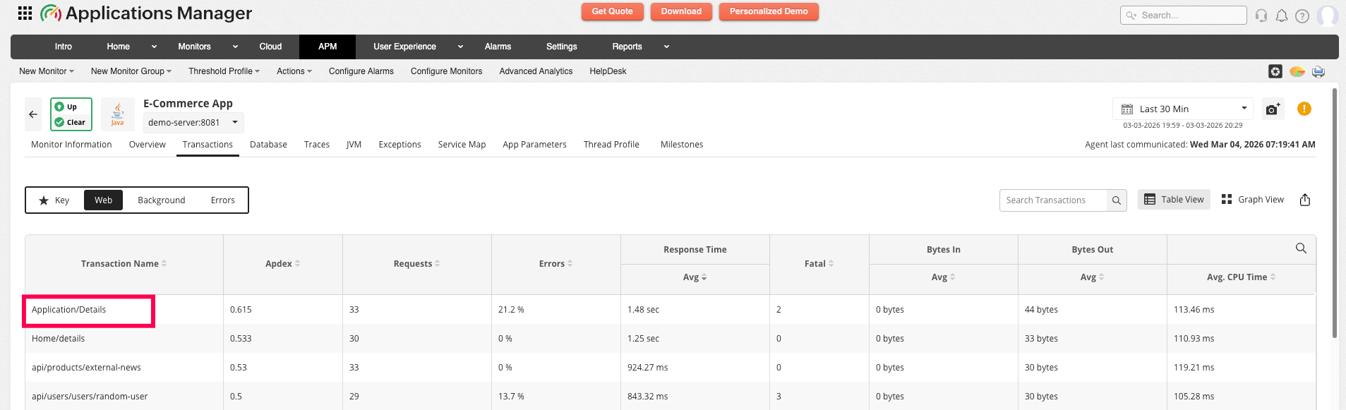 Note: Applications Manager's APM Insight displays the details for a maximum count of 50 transactions and 75 traces.