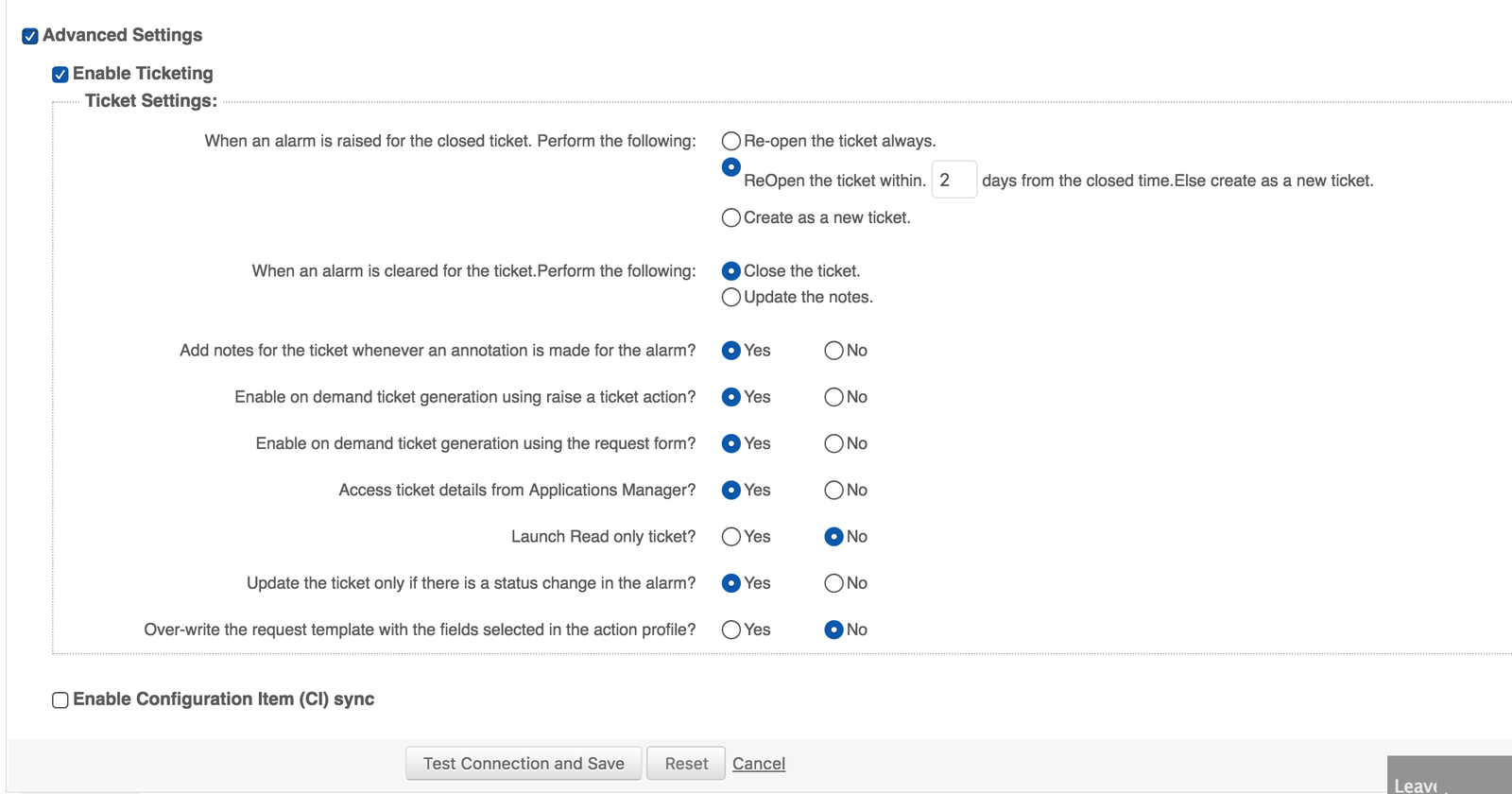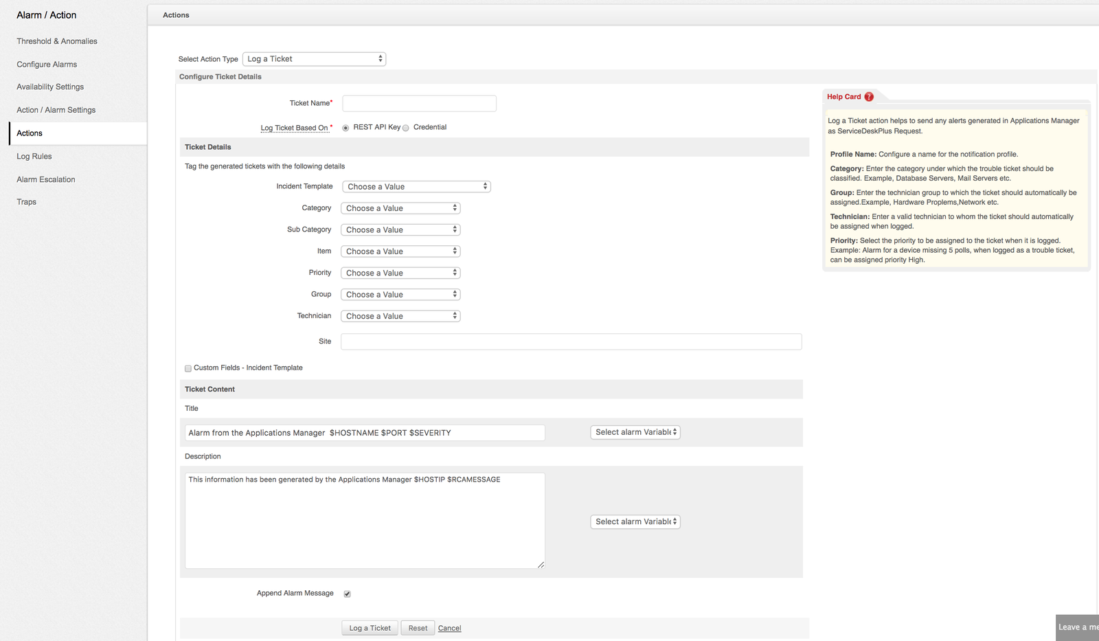 With APM-SDP integration, configure this alarm action as a ticket action in Applications Manager and every time an alarm is raised