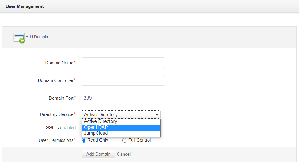 Group similar users together in the form of user groups. Assign various user roles to the user group. Add new domains and import users and user groups from the newly added domains using the authentication module. Supported directory service domains include Active Directory, OpenLDAP, and JumpCloud. You can then login to Applications Manager using Active Directory/LDAP/JumpCloud credentials by choosing the respective domains.
