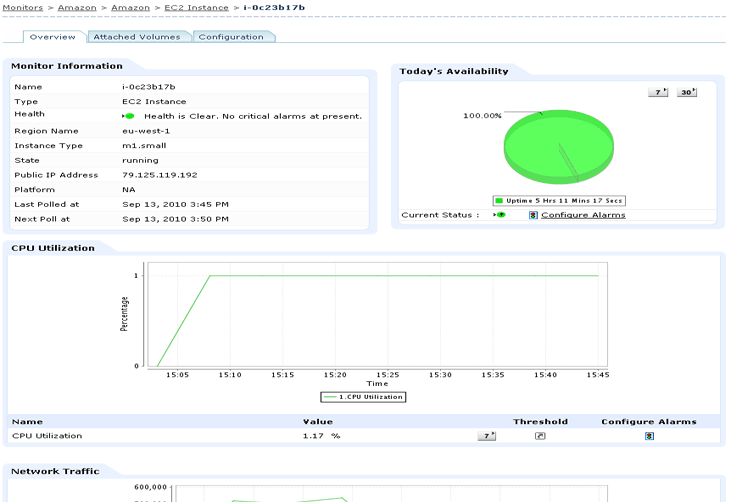 • Monitor availability, health and performance of Amazon EC2, RDS instances and attached EBS volumes. Metrics shown include CPU utilization, storage space, network traffic, network latency, disk reads/writes, etc.