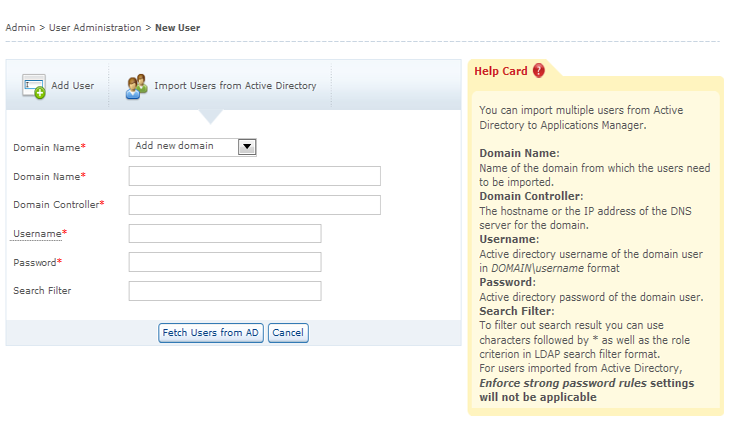 Import users from Active Directory using Active Directory (AD) authentication module. This enables you to log in to Applications Manager if you have an account in an Active Directory domain and helps in a simple, centralized and focused password and roles security.