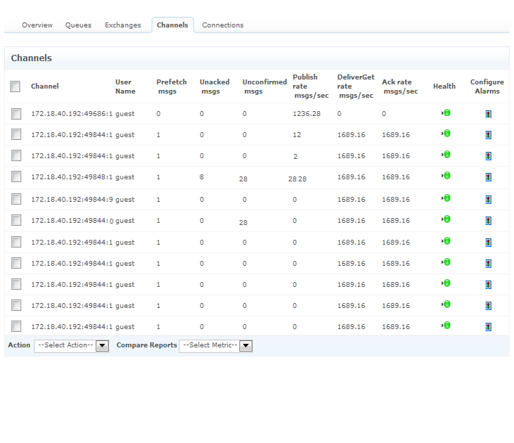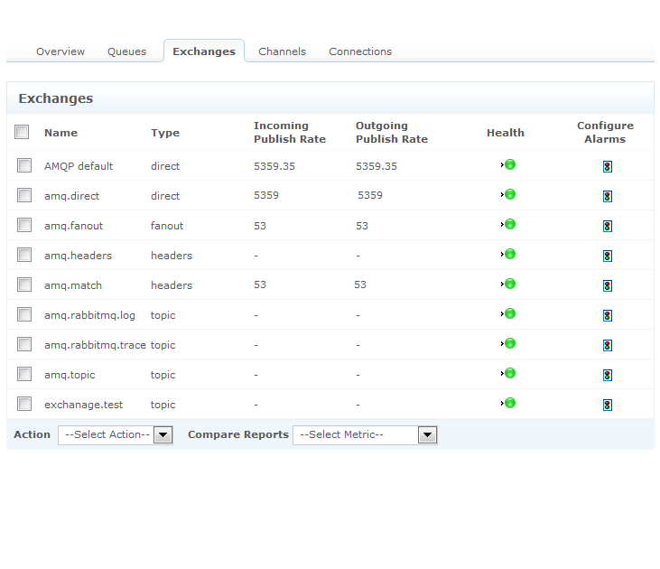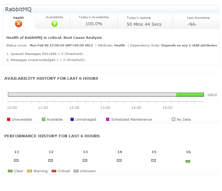 Support for monitoring the performance of VMware vFabric RabbitMQ messaging systems. Components monitored include Queued messages, node details like Socket descriptors and Erlang process utilization, message publish rates, connections, exchanges, channels, etc.