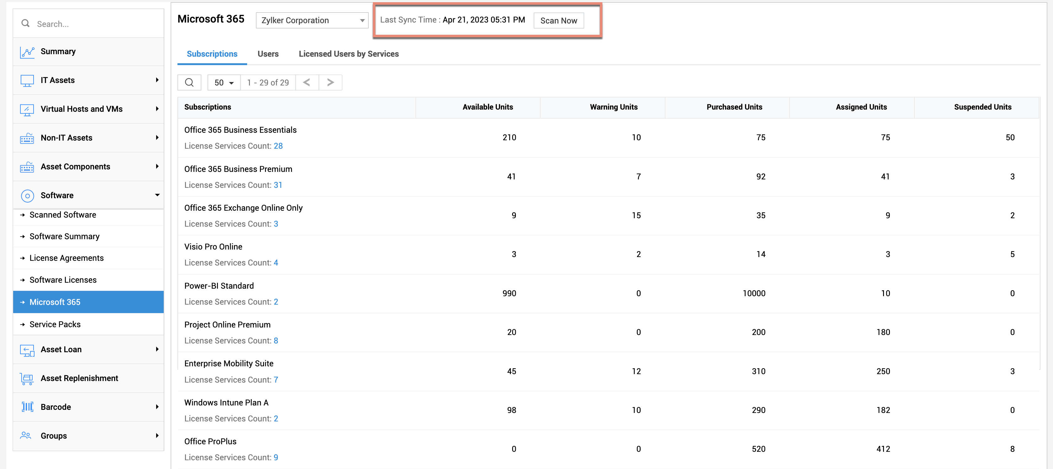 The last sync time is displayed on the top of the page. Administrators can update the subscriptions and user details anytime by clicking Scan Now.