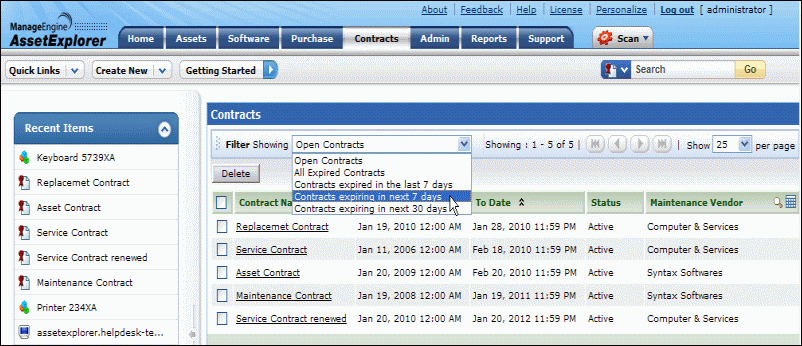 The contract list view page displays all the active and expired contract configured in AssetExplorer application. The page includes various useful functionality such as,