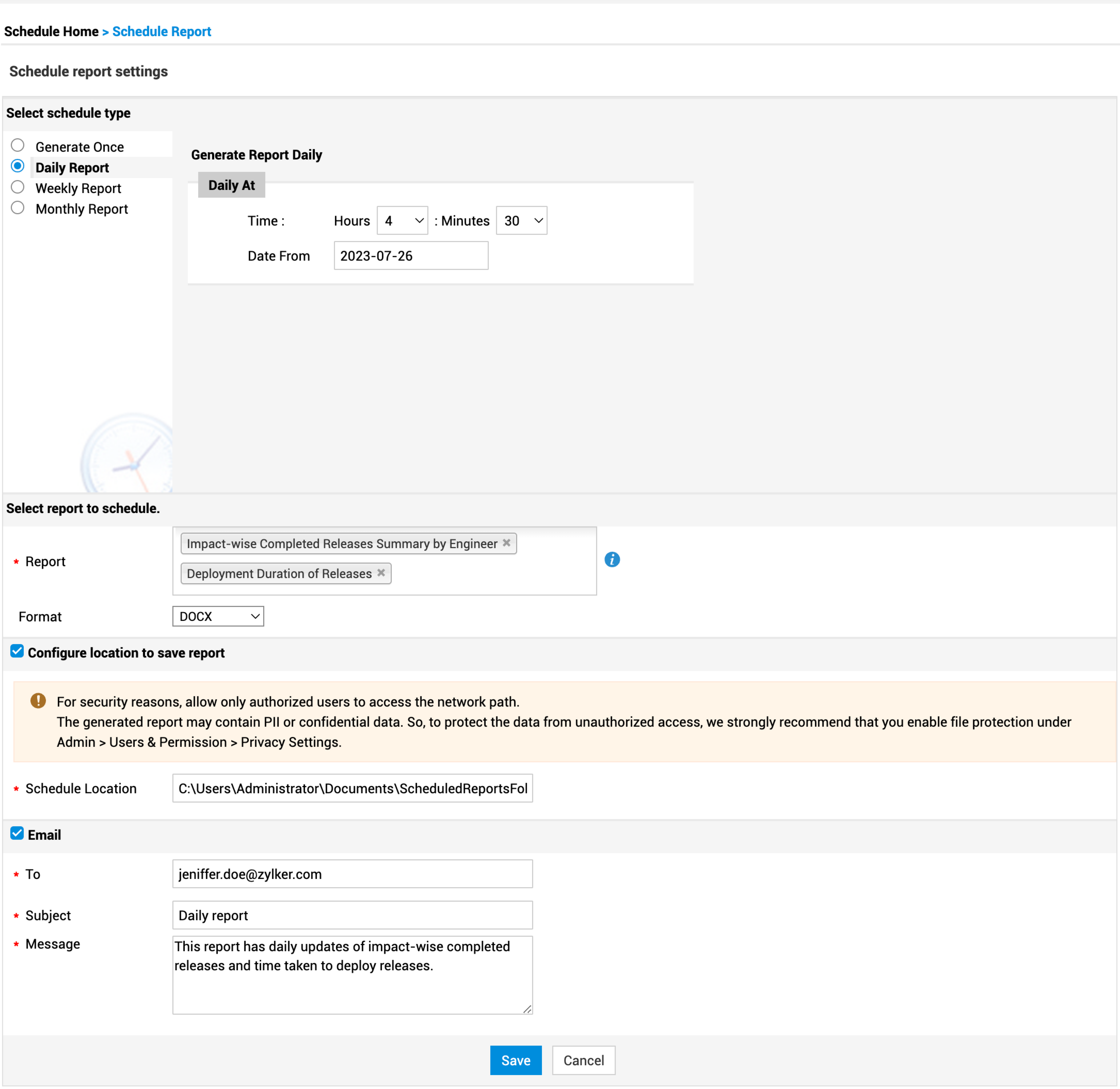 Schedule report settings allow you to automatically generate multiple reports at a scheduled time. The reports can be generated in PDF, XLS, XLSX, HTML, Inline HTML, CSV, DOC, DOCX, or XML file formats and shared by email. You can also configure a location to save the scheduled report.