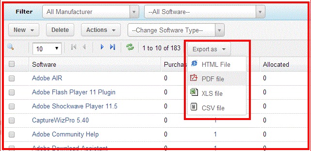 Asset Explorer allows exporting of Software License details [from Software License Listview page] and Scanned Software details [from Scanned Software Listview page] as PDF/XLS/HTML/CSV files.
