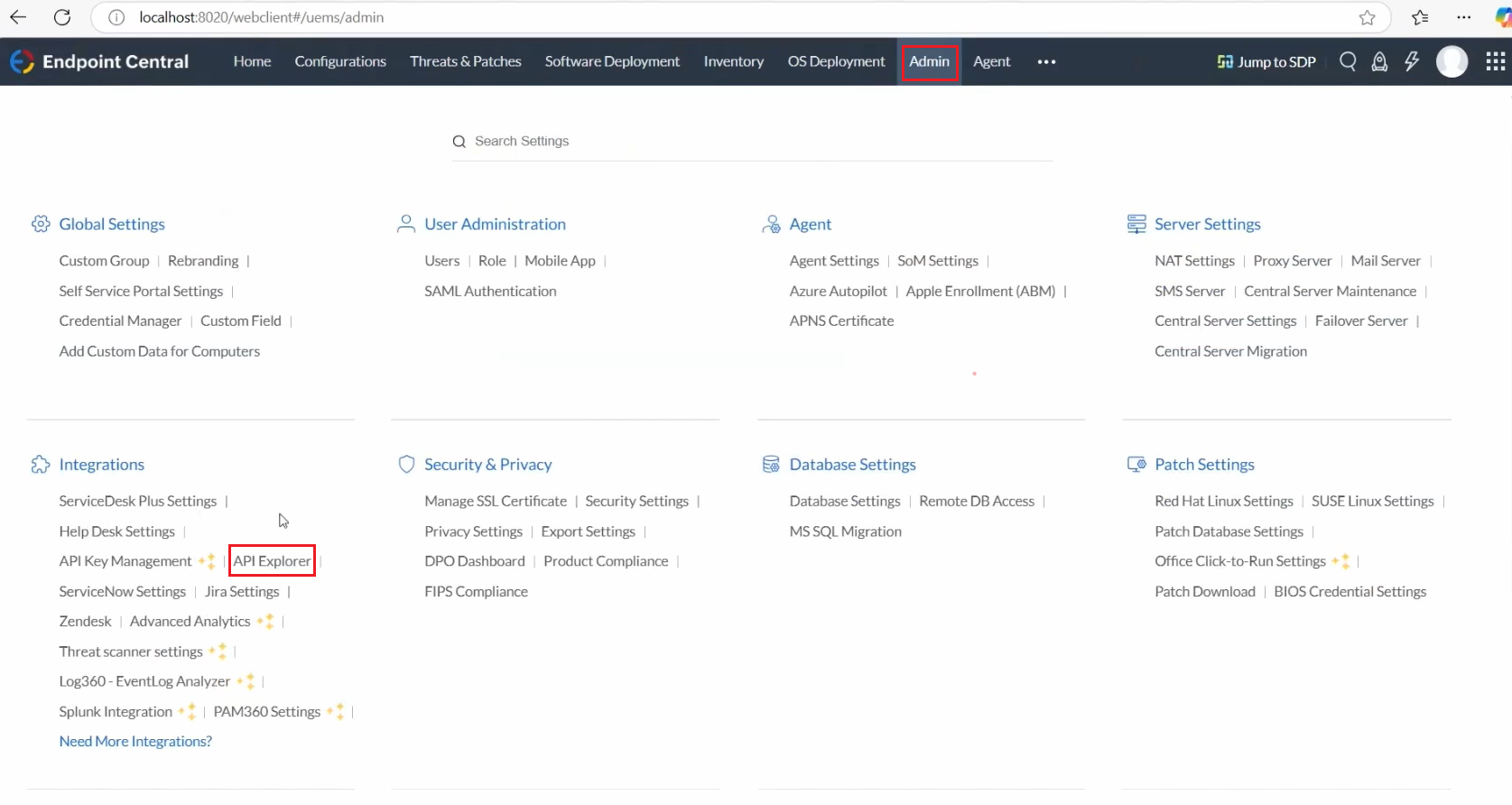 1. In the Endpoint Central Server console, click on Admin; under Integrations, click on API Explorer.