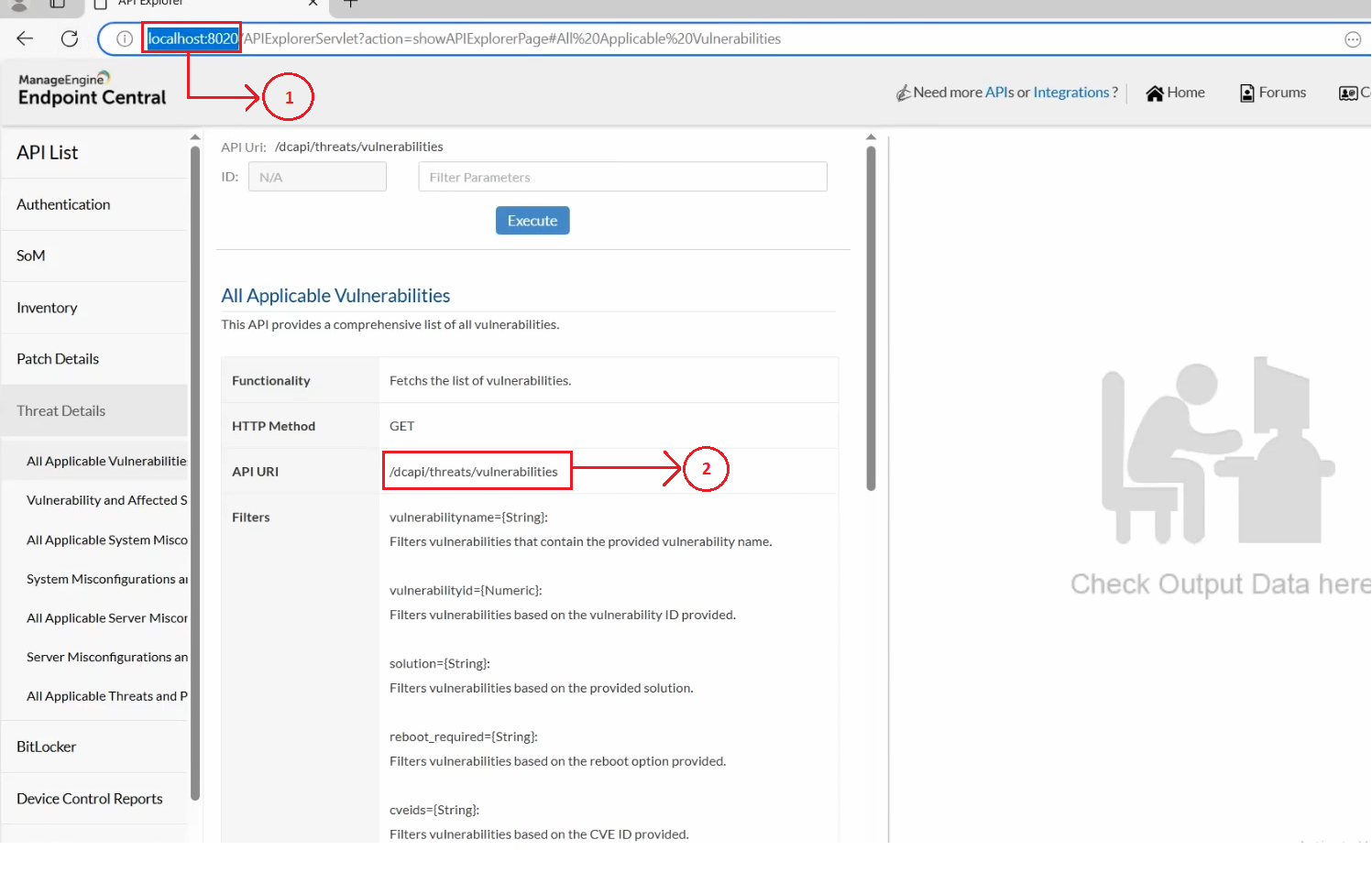 • The second part of the URL is the specific API URI from the API page. In this scenario: /dcapi/threats/vulnerabilities