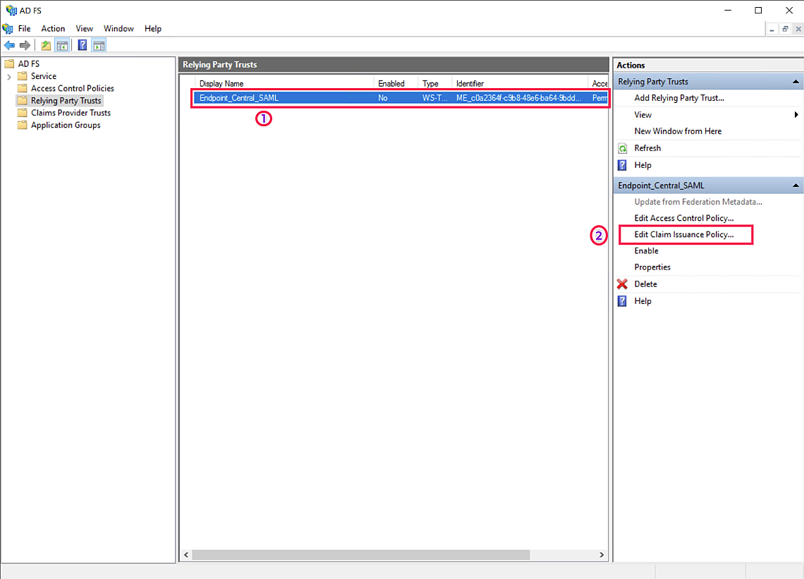 Select the added Relying Party Trust (1)(Endpoint_Central_SAML) and Click on Edit Claim Issuance Pulicy(2).