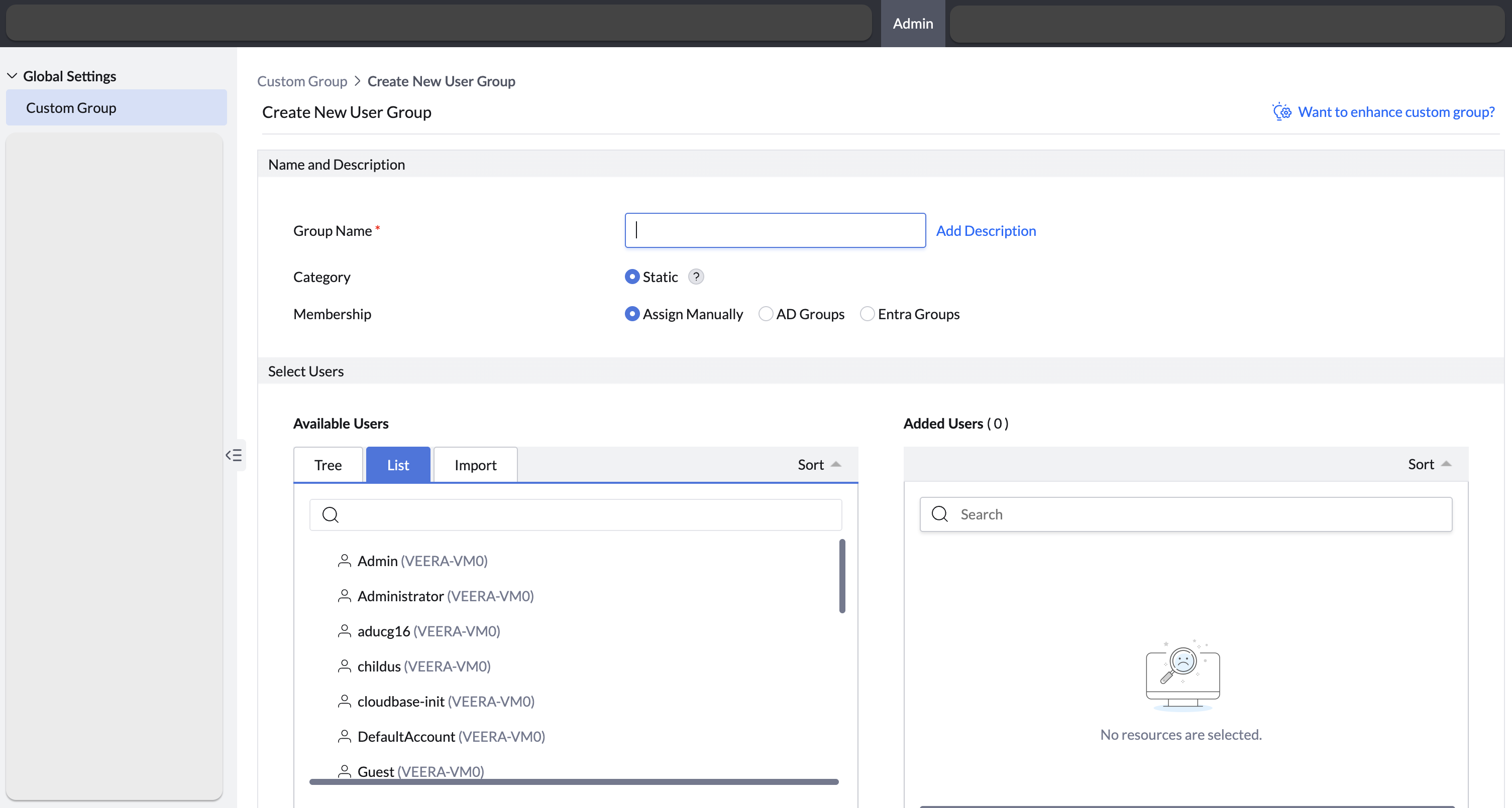 Unlike dynamic groups based on criteria, user custom groups are static groupings — meaning you control the membership directly. Users can belong to multiple custom groups, and groups can span across domains. Only technicians with administrator role access can create or manage these groups.
