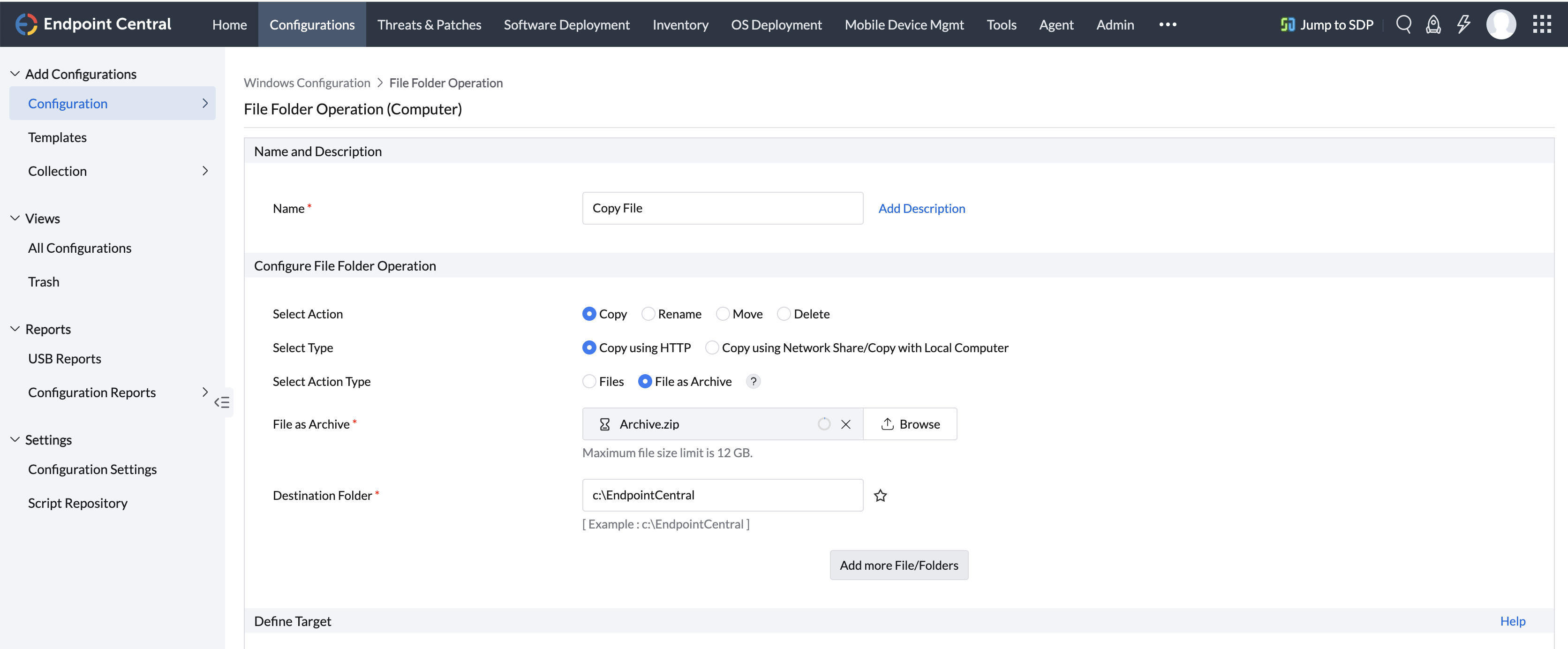 The file folder operation helps you to copy, delete, move, rename files and folders in a computer. By enabling the file folder configuration in Endpoint Central, files and folders across several computers can be copied, renamed, deleted and moved with ease. This configuration enhances the workflow of employees, as it enables them to access and use files efficiently and helps maintain proper storage. The file folder operation also helps to eliminate susceptible files and secure machines from threats.
