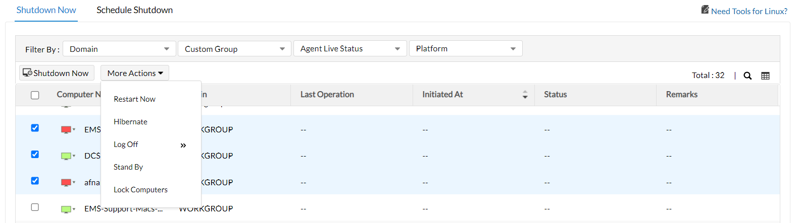 - Navigate to Tools -> Remote Shutdown. All the managed devices will be listed here.
