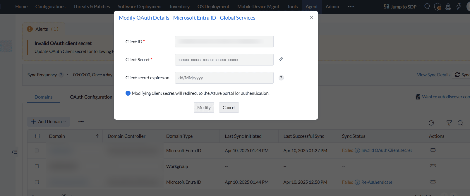 - Enter the correct client secret and proceed with authenticating (click modify).