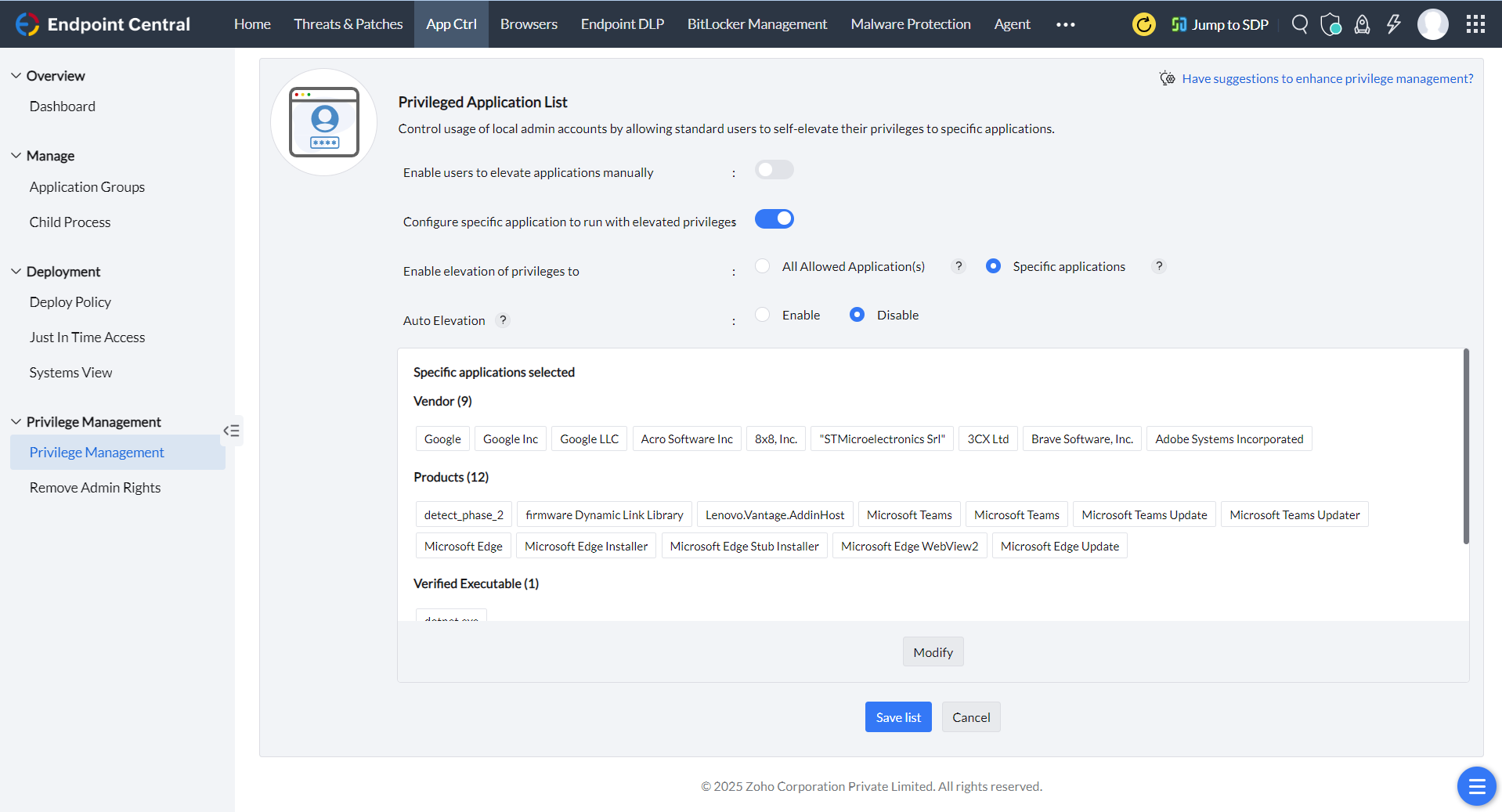 With Endpoint Central, administrators can implement application whitelisting and blacklisting, enforce least privilege principles, remove unnecessary admin accounts, and provide Just-in-Time (JIT) access. This approach minimizes attack surfaces while maintaining operational efficiency.