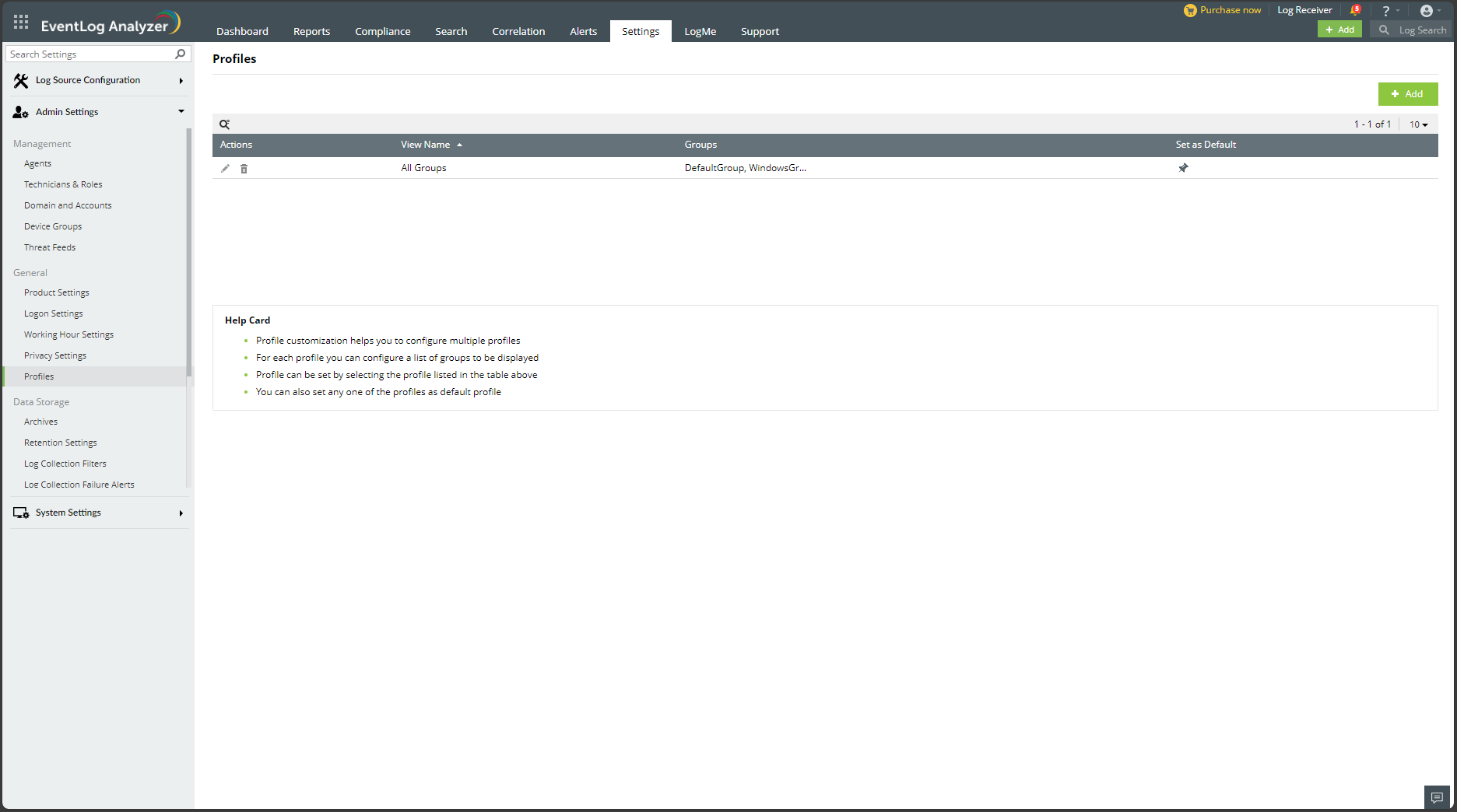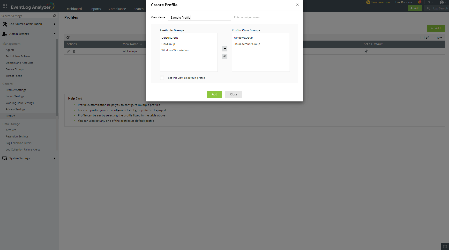 EventLog Analyzer gives you the option of selecting the default devices whose logs will be used to populate the module. The profiles allow you to accumulate devices groups into profiles and select one of them as the default profile to form the basis of the product.