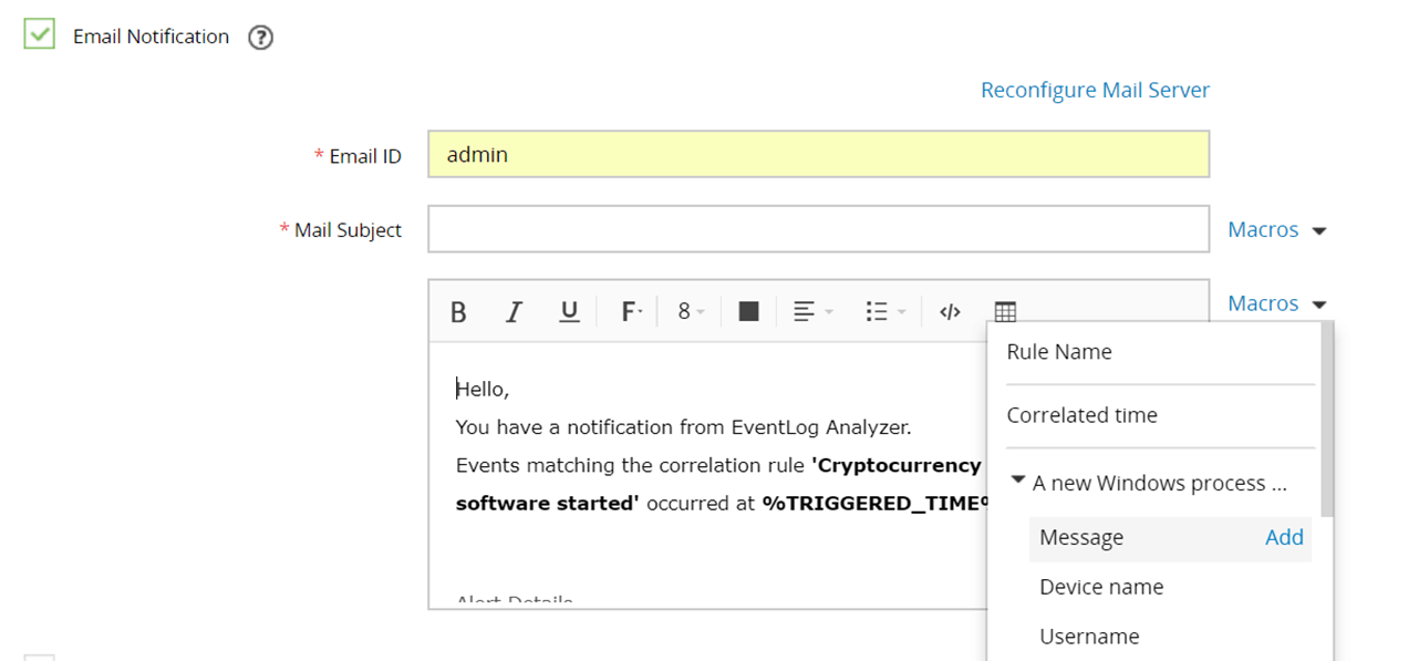 - If the mail server is not configured in EventLog Analyzer, you will be prompted to when Notify by Email option is selected.