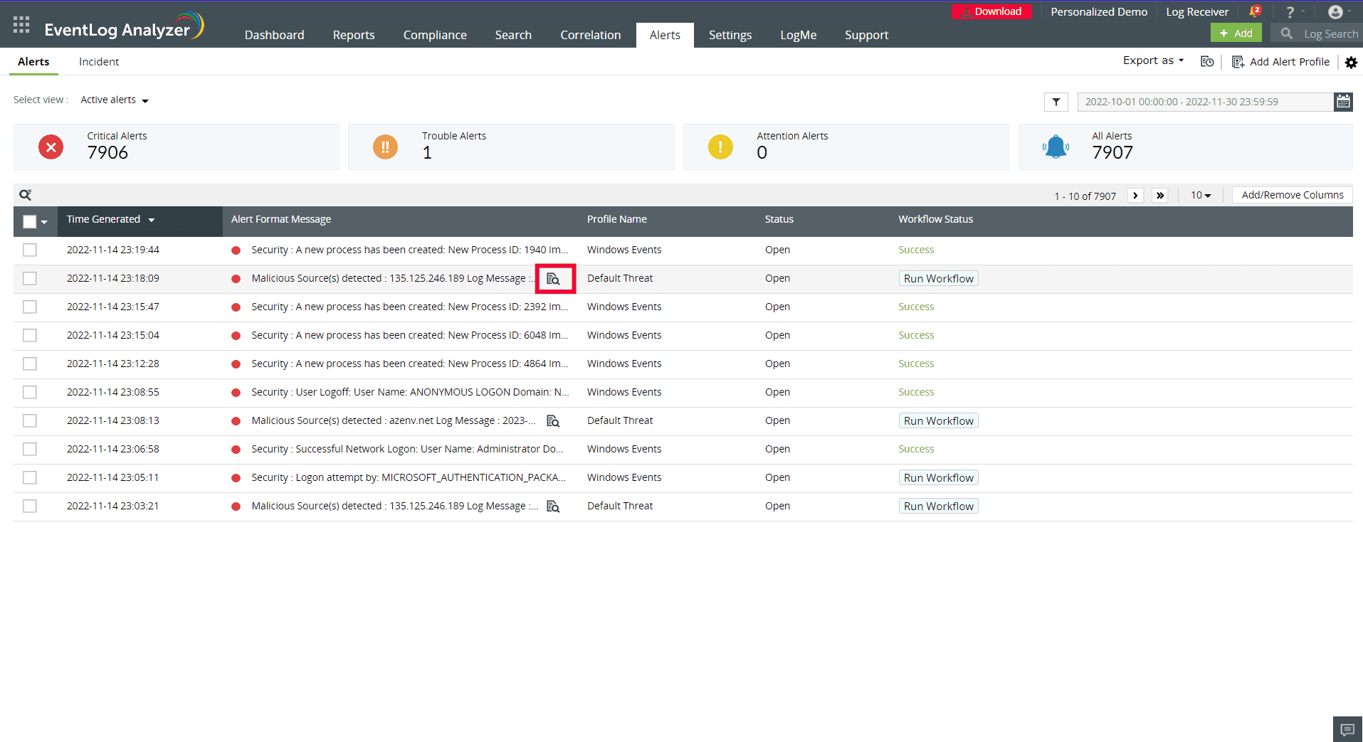 View the generated alerts on the Alerts summary page, and click on the Threat Analysis icon to open the Incident Workbench and analyze further.
