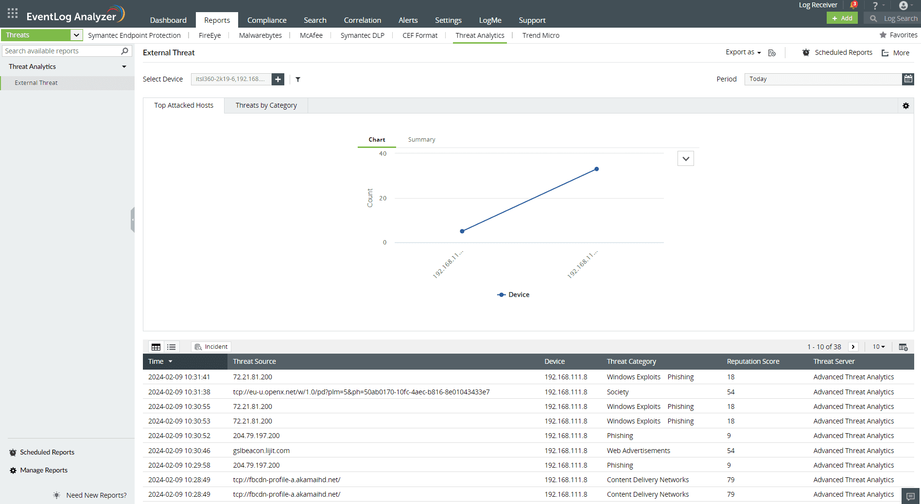 EventLog Analyzer supports the following vendors for the Advanced Threat Analytics data: