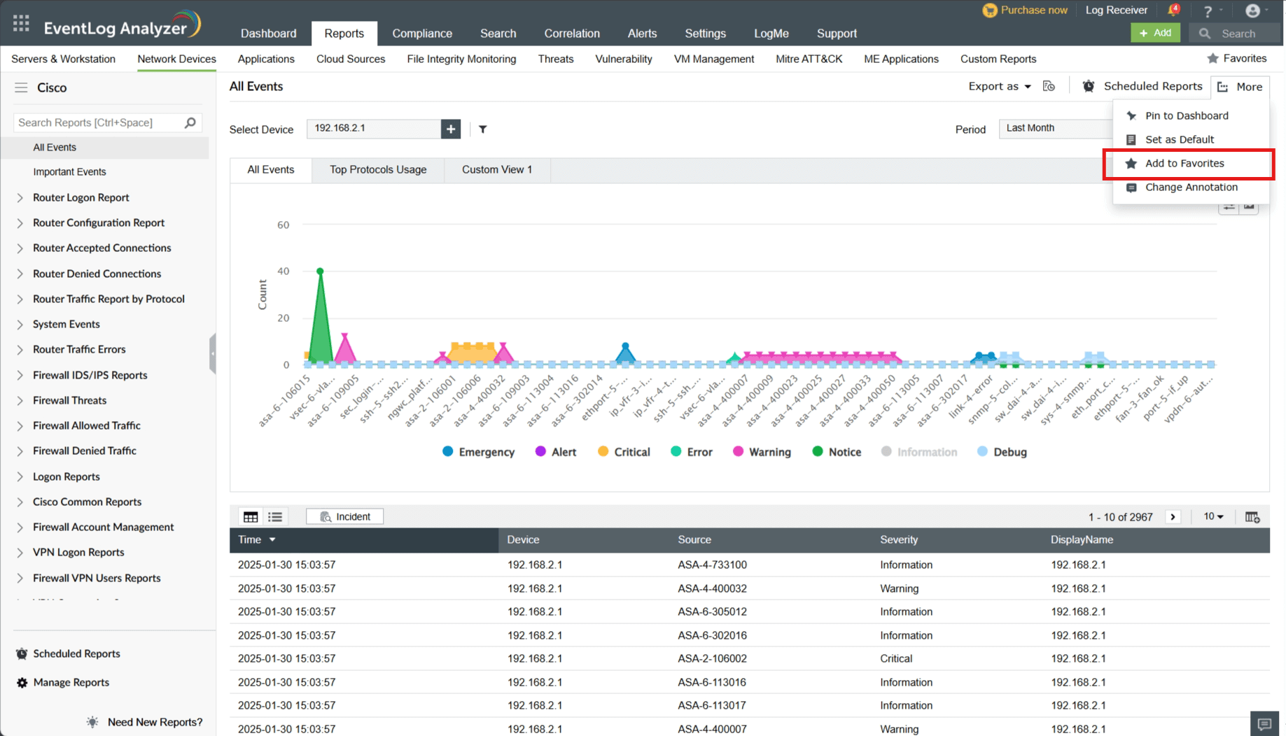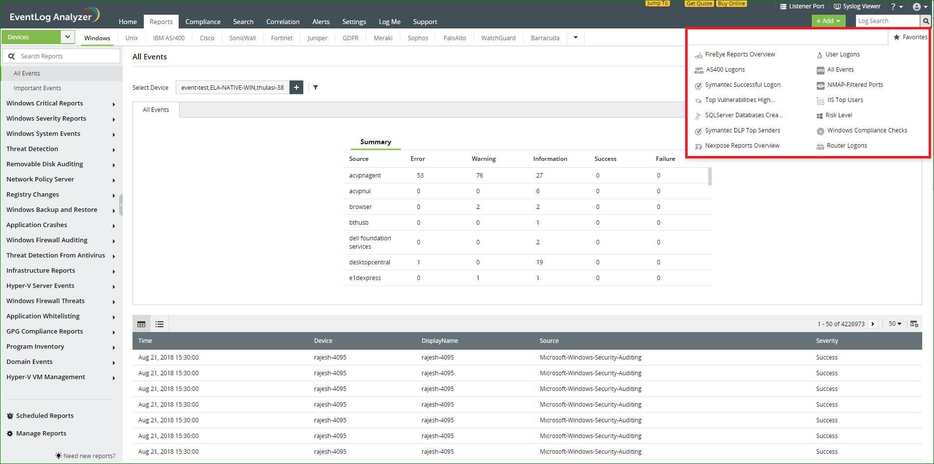 Note: While upgrading to the latest build of EventLog Analyzer, favorite reports in Builds 11212 and below will not be retained.