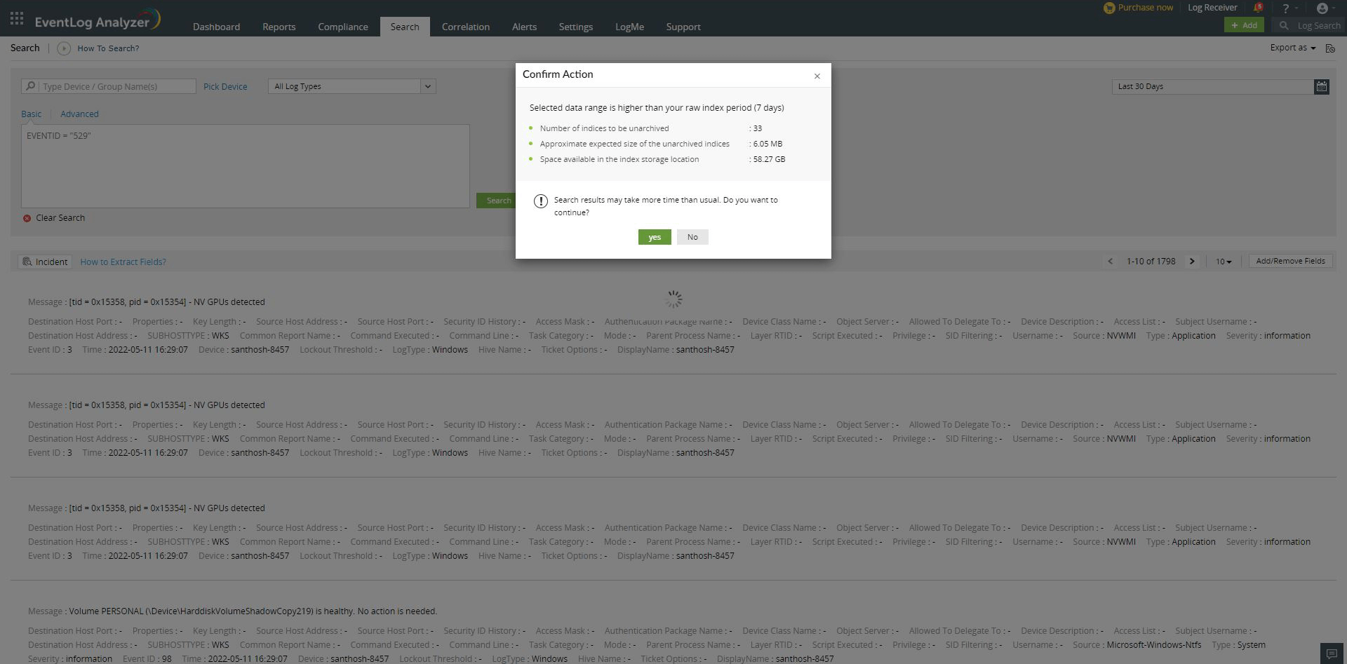 EventLog Analyzer provides a robust search engine to help you retrive log data during investigations. You can search raw logs collected by the server and detect events of interest such as misconfigurations, viruses, unauthorized access, unusual logons, applications errors, and more.