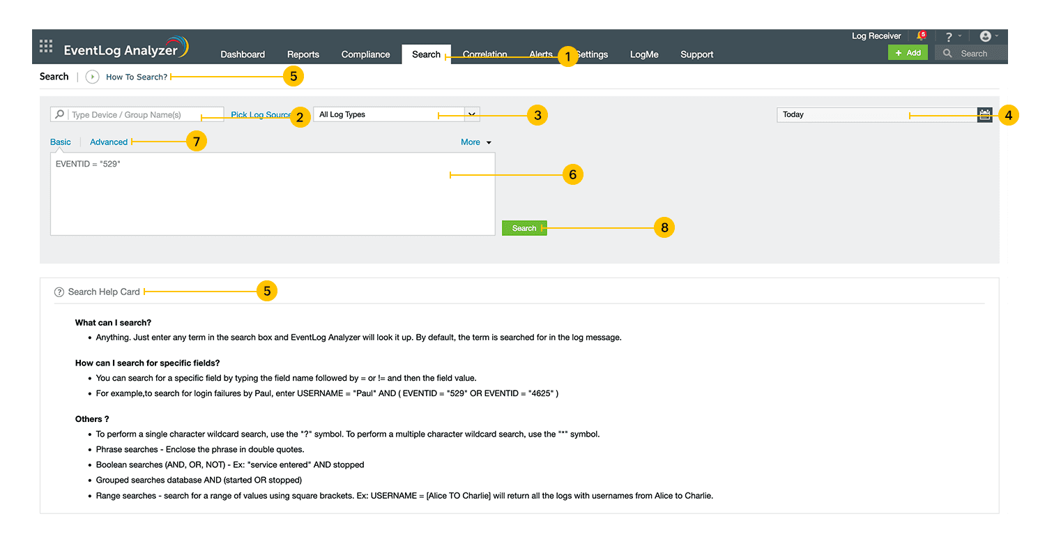 EventLog Analyzer provides basic and advanced search functionalities. Types of search queries supported are wild-card, phrase, boolean, grouped searches.