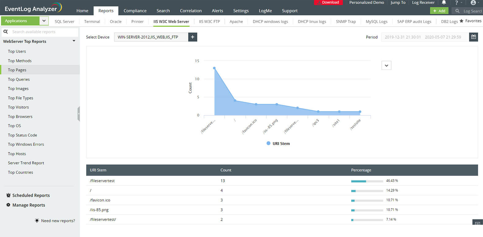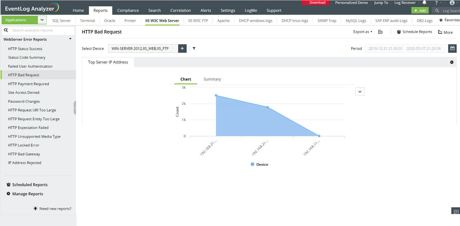 With an exhaustive list of reports on IIS web servers, you can quickly identify and fix frequently occurring errors including failed user authentication, HTTP bad requests, and gateway timeouts.