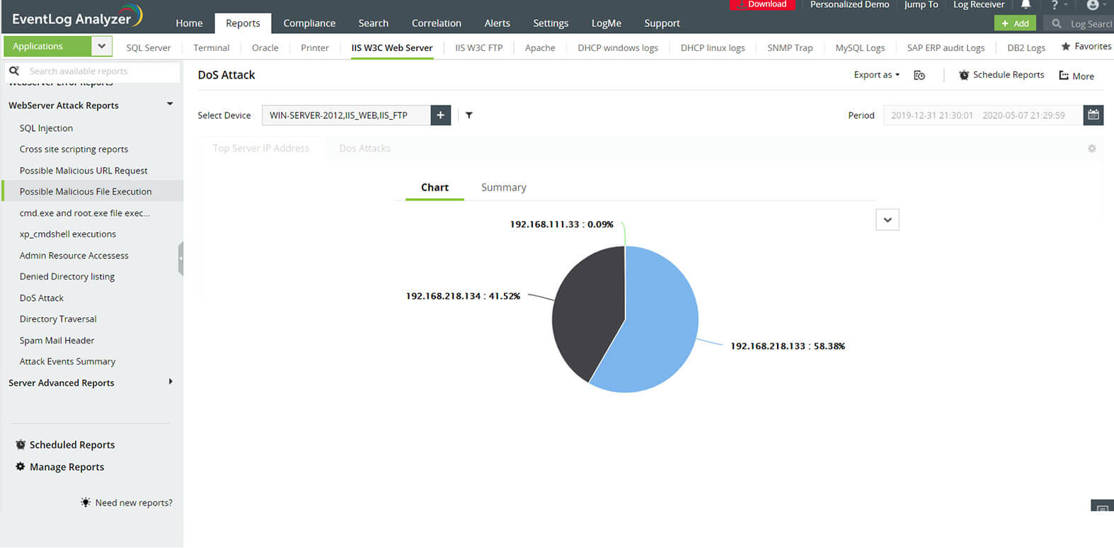 Get instant alerts if your IIS web server is subjected to attacks such as SQL injection or distributed denial of service. Once an attack is detected, you can also automate your response to such critical security events by configuring workflows. A swift response to security events is crucial to protect your server's confidential data and prevent your site from going down.