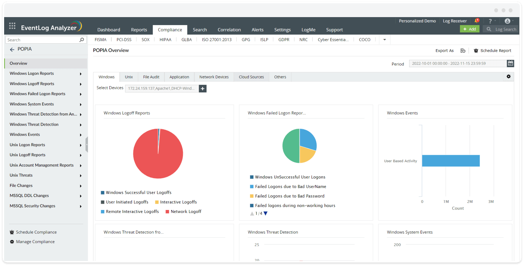 These reports help in tracking any changes, failures, or suspicious activities within the Windows operating systems and Unix systems. In addition, monitoring network devices for signs of attacks helps identify potential vulnerabilities or unauthorized access attempts on network devices. Since network devices are often the gateway for accessing stored data, including personal information, monitoring these reports helps ensure that the network is secured against breaches.