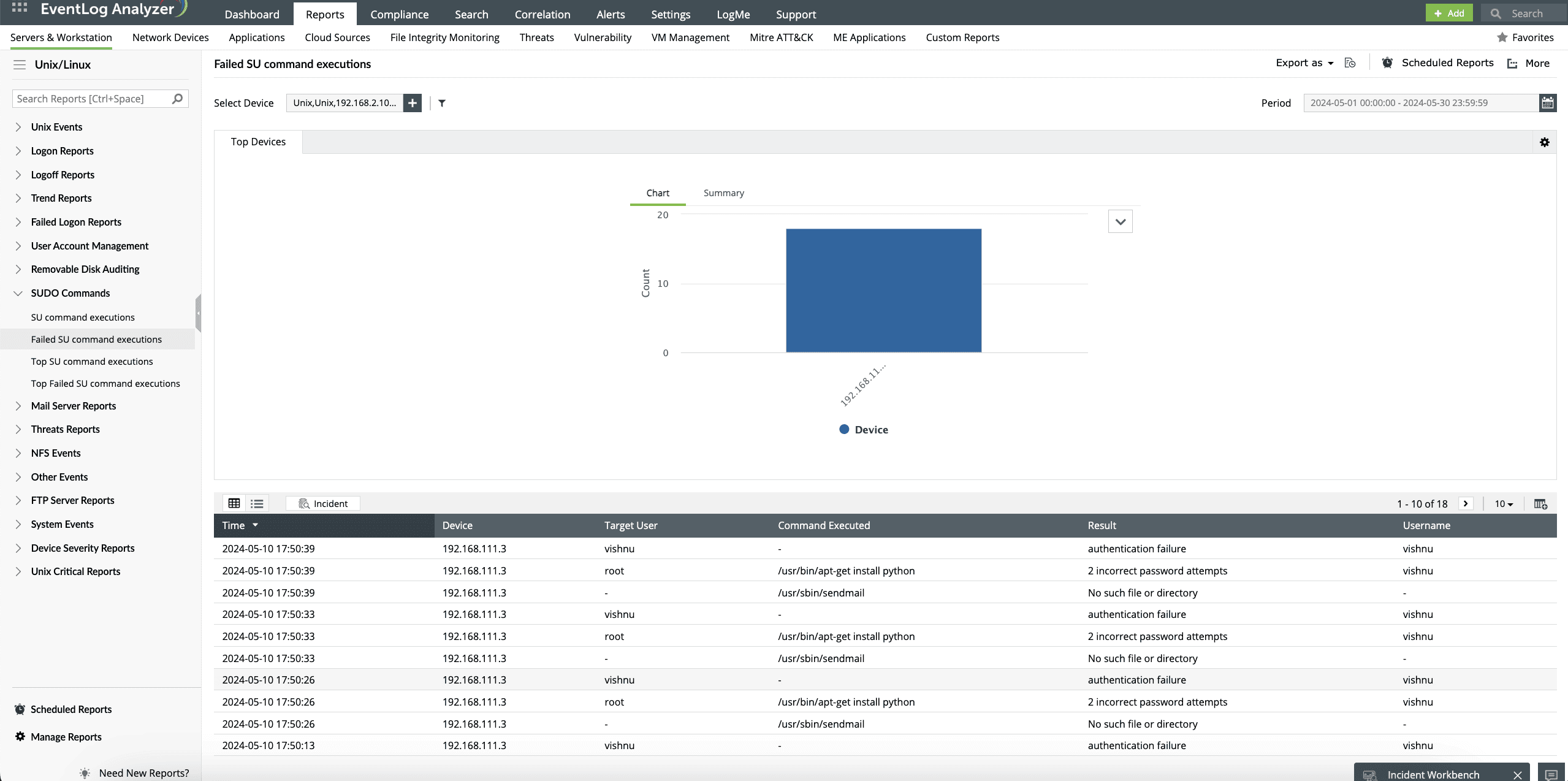 EventLog Analyzer allows you to track all sudo command activities. The execution details of critical sudo commands, such as changing interactive shell, running a command through a different user, and running a Linux command with sudo access, can be monitored.