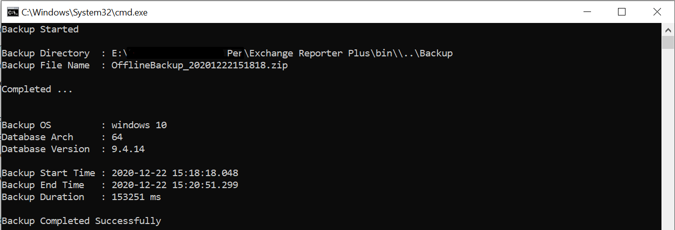 4. Data in the default database of Exchange Reporter Plus will be backed up and stored as a folder (e.g. OfflineBackup_20xxxxxxxxxxxx.zip) under <Exchange Reporter Plus installation directory>\backup path.