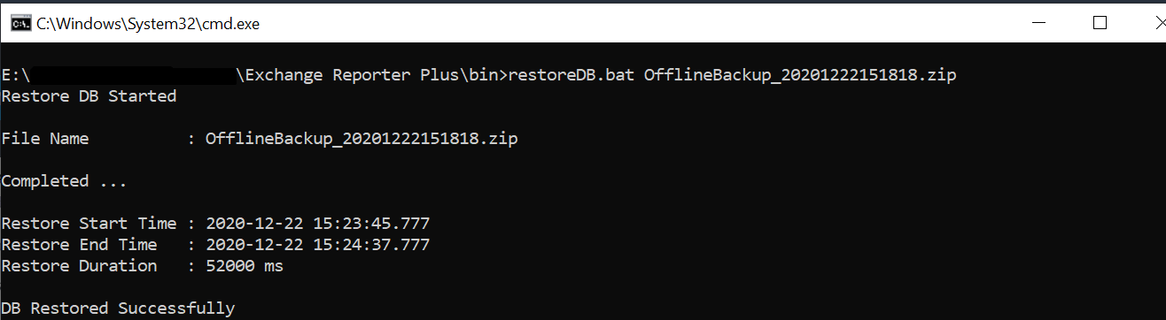 3. Execute the restoreDB.bat command along with the ZIP file, using the command prompt, to restore the database (e.g. restoreDB.bat OfflineBackup_20xxxxxxxxxxxx.zip)