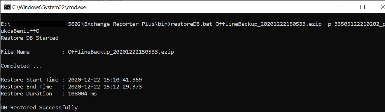 3. Execute the restoreDB.bat command, along with the ZIP file, using the command prompt with a -p option to specify the password (e.g. restoreDB.bat OfflineBackup_20xxxxxxxxxxxx.ezip -p xxxxxxxxxxxx02_pukcaBenilffO).