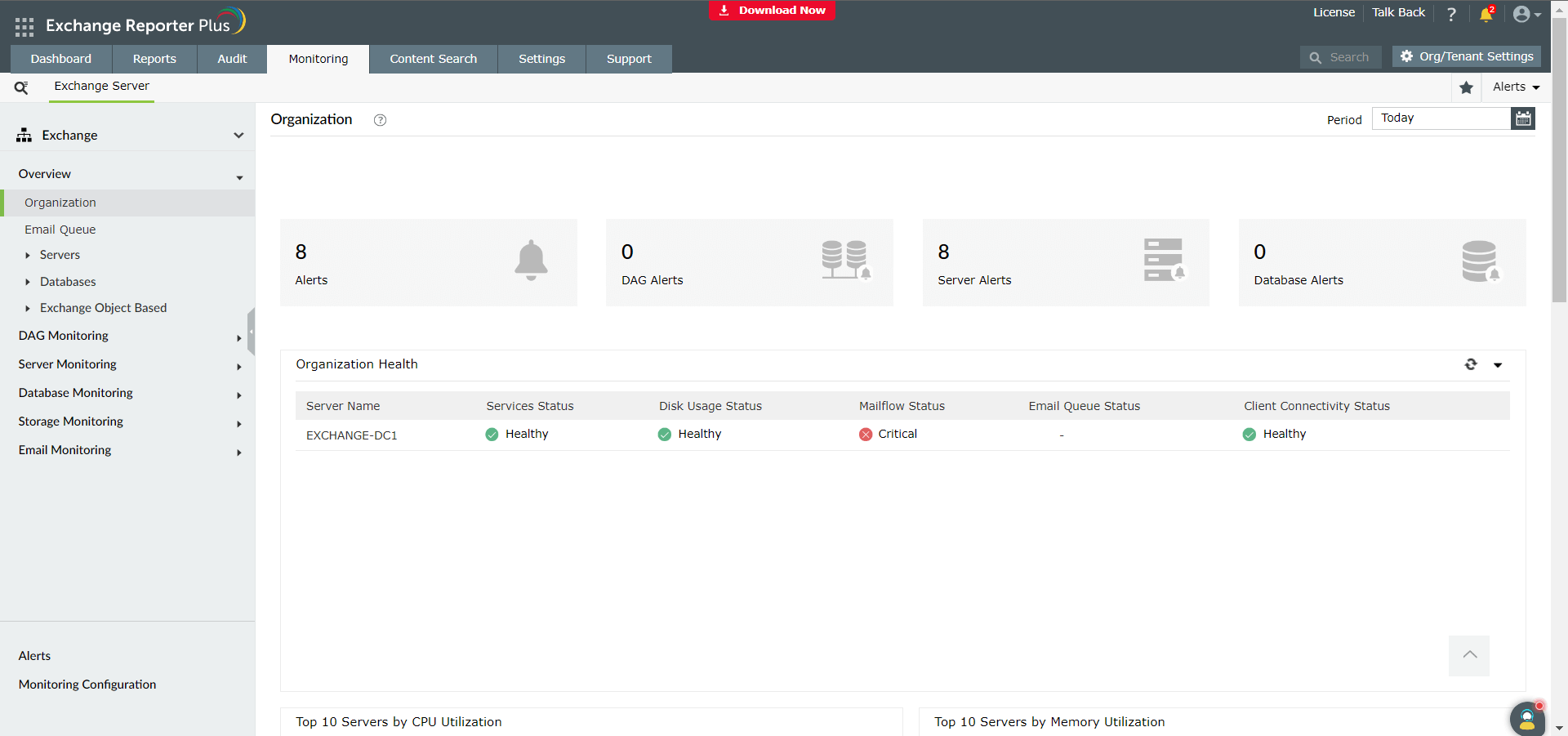 - Servers: Displays dashboard views of various aspects related to Exchange servers; various roles, including client access and mailbox; disk usage; and CPU or memory usage.