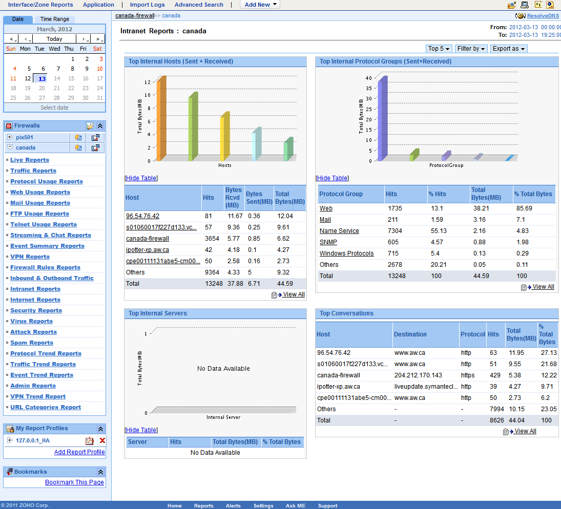 The details of the total internal traffic (sent plus received) of the network (Intranet) by Top Conversations (Internal), Internal Hosts, Internal Protocol Groups, and Internal Servers for the specific firewall are provided in the form of graph and table in the Intranet Traffic Reports. The granular details of the intranet traffic for your network through each of your configured firewall can be drilled down.