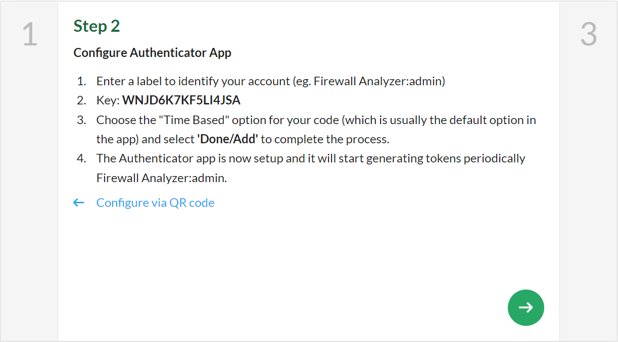 - If the default 'admin' user is unable to login to the product, and has lost the configured mobile device, contact our support at fwanalyzer-support@manageengine.com to reset the TOTP secret for the default 'admin' user.