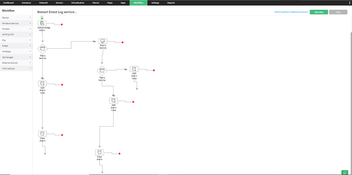 OpManager's IT automation workflows are code-free and out-of-the-box offers predefined checks and actions. It includes an agile and flexible drag-n-drop workflow builder which initiates IT workflow on network faults or on a routine basis.